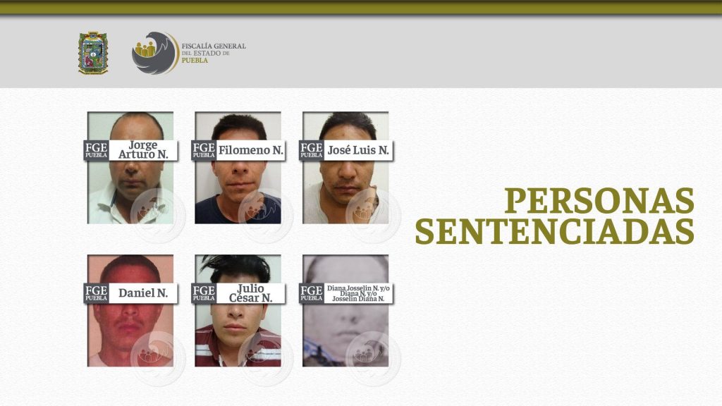 La Fiscalía General del Estado de Puebla logró sentencia condenatoria contra Jorge Arturo N. alias “El Borrego”, Filomeno N. alias “El Pillín”, José Luis N. alias “El Cholo”, Daniel N. alias “El Conejo”, Julio César N. alias “El Caracol” y Diana Josselin N. y/o Diana N. y/o Josselin Diana N., penalmente responsables del delito de secuestro agravado.
