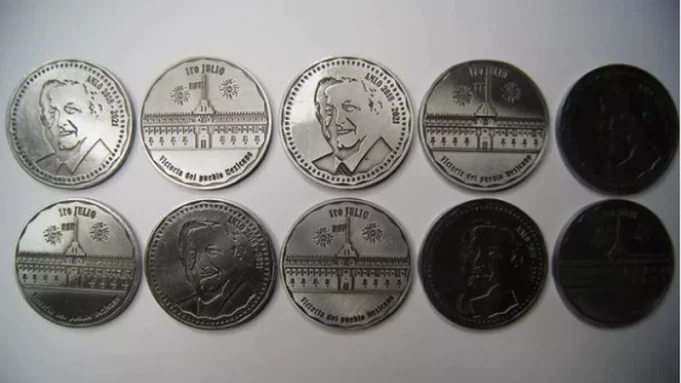 Estas peculiares monedas con el rostro de López Obrador en una cara, junto a la frase “AMLO 2018-2021, y en la otra la imagen de Palacio Nacional con las leyendas “1ro de julio” y “Victoria del pueblo mexicano”, ya se comercializan en internet.