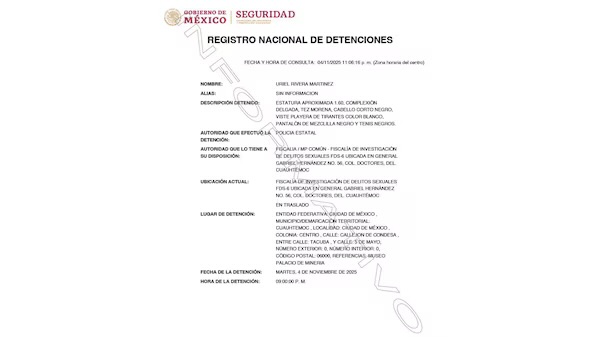 Después de la detención, Rivera Martínez fue ingresado al Registro Nacional de Detenciones y puesto a disposición de la Fiscalía de Delitos Sexuales de la capital.