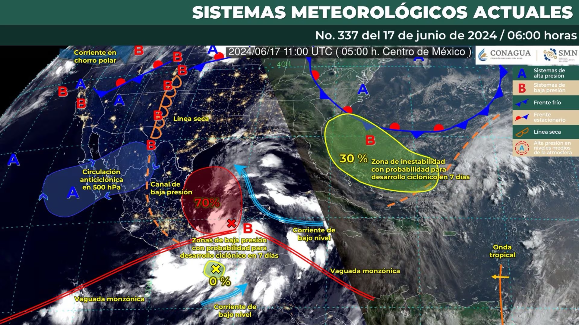 Sin embargo, también se vigila una zona de baja presión al sur de las costas de Chiapas y Guatemala, con menos del10 por ciento de probabilidad para desarrollo ciclónico en las próximas 48 horas y siete días. “Se localiza aproximadamente a 20 km al oeste de la desembocadura del Río Suchiate (frontera entre México y Guatemala)”, indicó en redes sociales el Meteorológico Nacional. De evolucionar, este sistema sería el primer ciclón de la temporada en el Océano Pacífico y se llamaría Aletta.