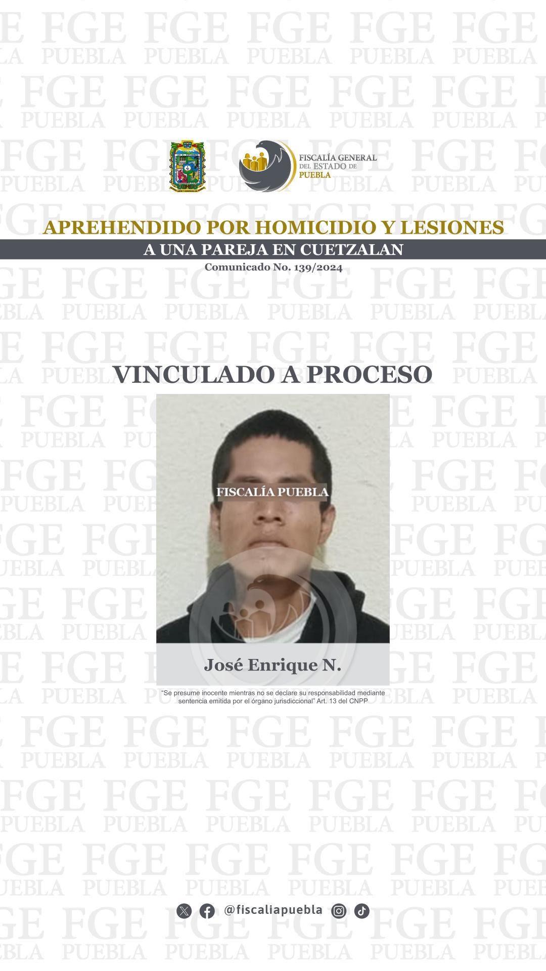 La Fiscalía General del Estado (FGE) de Puebla cumplió orden de aprehensióncontra José Enrique N. de 21 años, quien es investigado por los delitos de homicidiocalificado y lesionescalificadas.