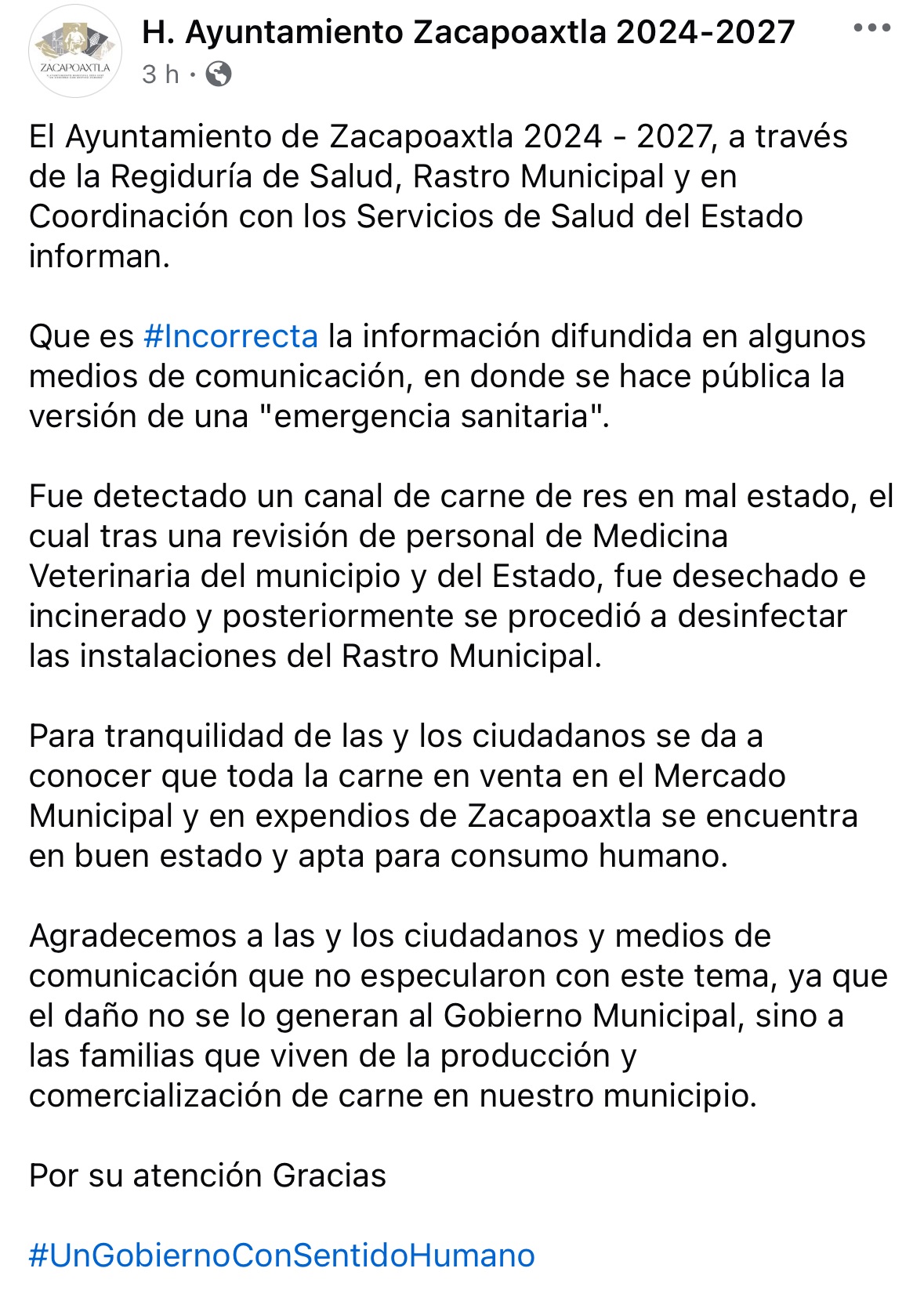 Zacapoaxtla Pue.- El Ayuntamiento de Zacapoaxtla, encabezado por el presidente municipal Margarito Rojas Parra, a través de la Regiduría de Salud y en coordinación con los Servicios de Salud del Estado, desmintió la existencia de una “emergencia sanitaria” en el municipio, como se difundió en algunos medios de comunicación, destacó en un comunicado.