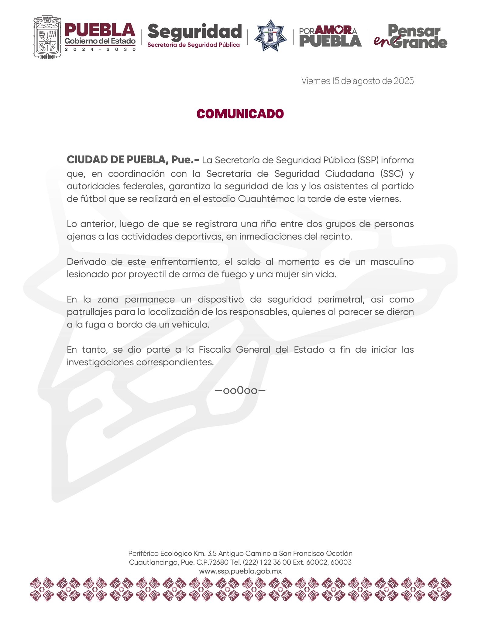 Puebla, Pue.– Horas antes del inicio del encuentro entre Puebla y Atlético de San Luis, correspondiente a la jornada 5 del torneo Apertura 2025 de la Liga MX, se registró una riña en las inmediaciones del Estadio Cuauhtémoc que dejó como saldo a una mujer sin vida y a un hombre herido por arma de fuego.