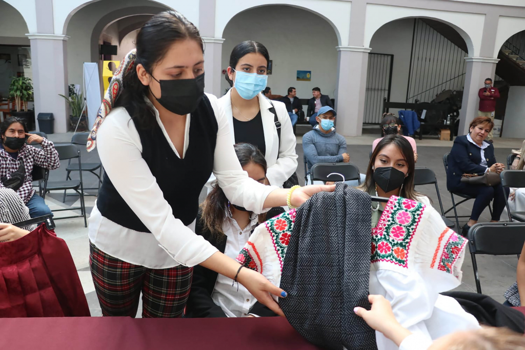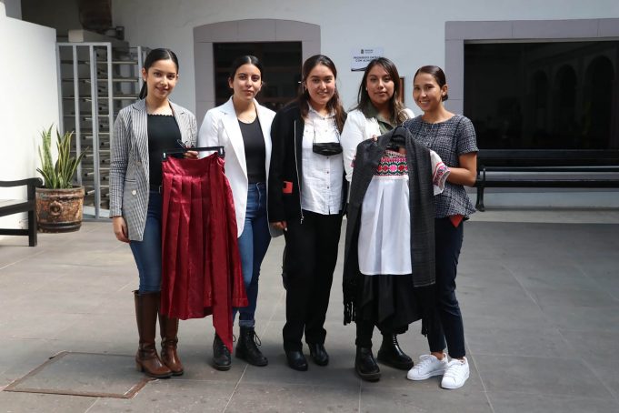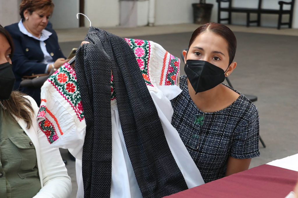 Durante el «Martes Ciudadano», las estudiantes, integrantes del grupo Jóvenes Creativos, precisaron que trabajan en conjunto con artesanas de la junta auxiliar de San Sebastián, quienes les comparten sus conocimientos sobre los principales componentes culturales que identifican a este municipio y que podrían plasmarse en las prendas (blusa, falda y chal).
