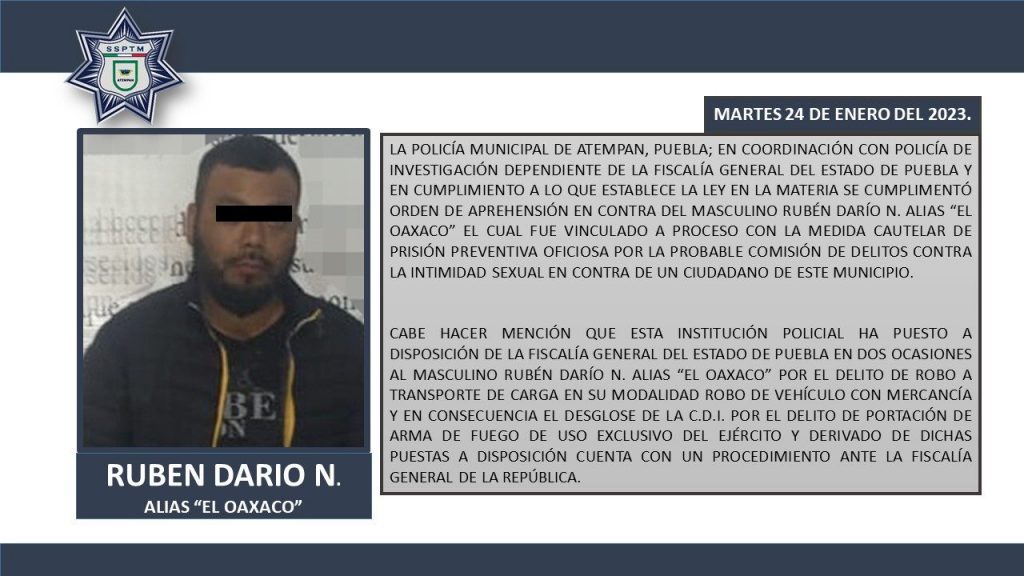 Gobierno de Atempan reconoció el trabajo de las Fuerzas Policiacas para la captura de Ruben Dario «N», conocido como «El Oaxaco», acusado por la probable comisión de delitos contra la intimidad de un ciudadano del municipio de Atempan.