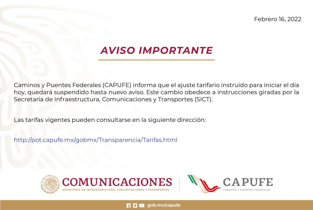 A través de redes sociales Capufe informó que la suspensión del alza de tarifa fue por instrucción de la Secretaría de Infraestructura, Comunicaciones y Transportes (SICT).