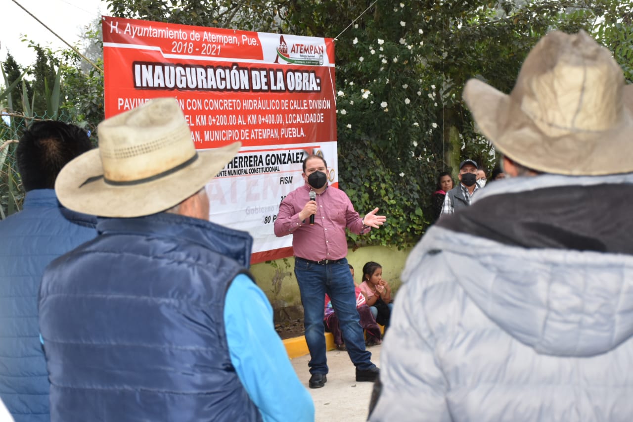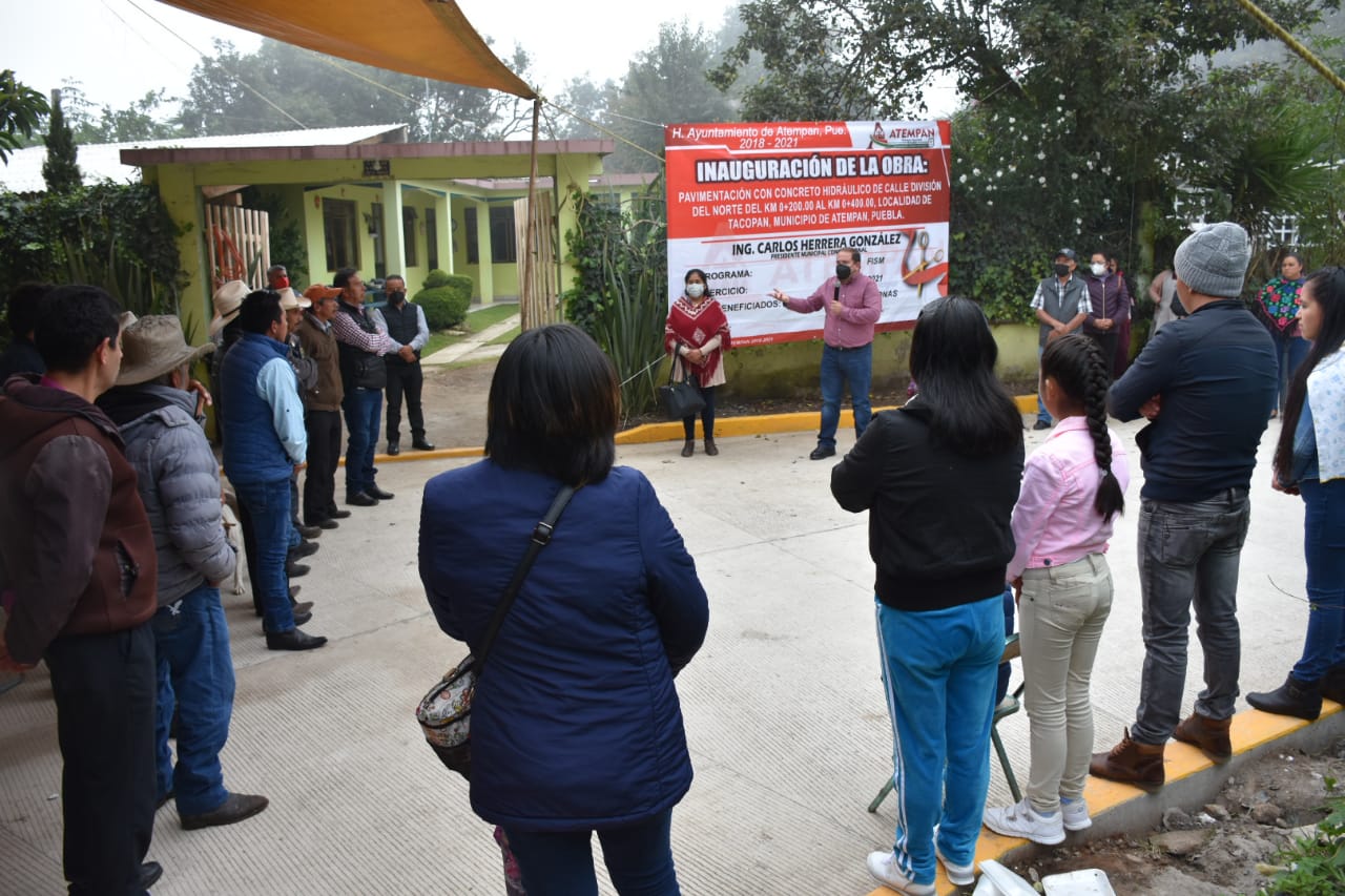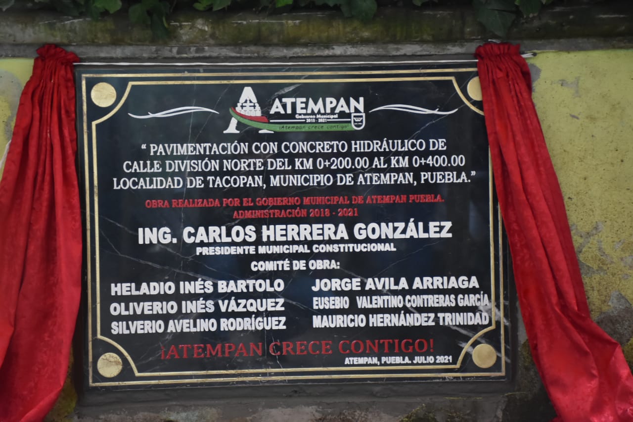 Atempan Puebla.- Carlos Herrera presidente municipal de Atempan inauguró la tarde de este jueves 8 de julio en la localidad de Tacopan, la obra de pavimentación con concreto hidraulico de la calle División del Norte, la cual traerá beneficios importantes a los habitantes de esta localidad.