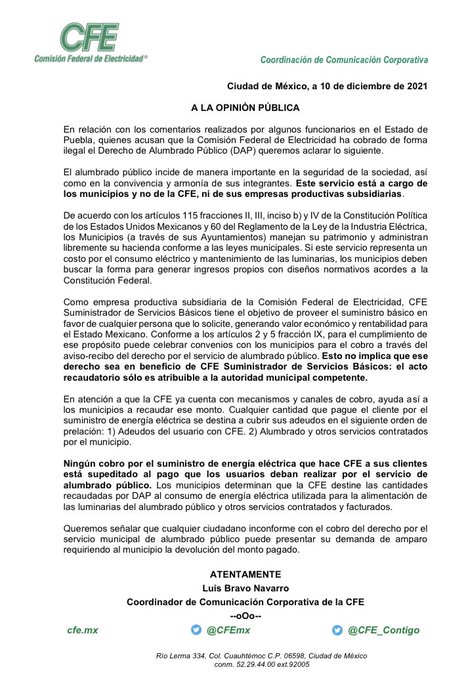 La Comisión Federal de Electricidad (CFE) se deslindó del cobro del Derecho al Alumbrado Público (DAP) que han cobrado varios municipios de Puebla, entre ellos la capital, donde se busca retomarlo a partir de 2022, por lo cual sugirió presentar demandas de amparo contra los ayuntamientos para exigir la devolución del dinero.