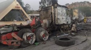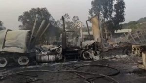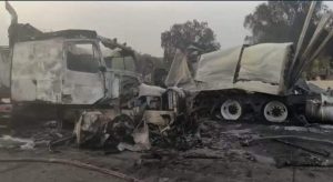 Primeros informes refieren que 10 tráileres chocaron, uno detrás de otro, lo que derivó en el incendio de las unidades.