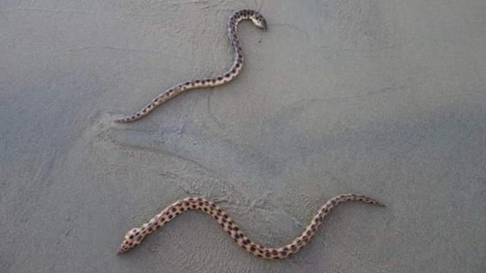 Protección Civil local colocó la bandera morada como señal de presencia de fauna peligrosa, al detectar la presencia de varias serpientes marinas de este tipo, que se sabe poseen un veneno neurotóxico que podría llegar a ser mortal para una persona.