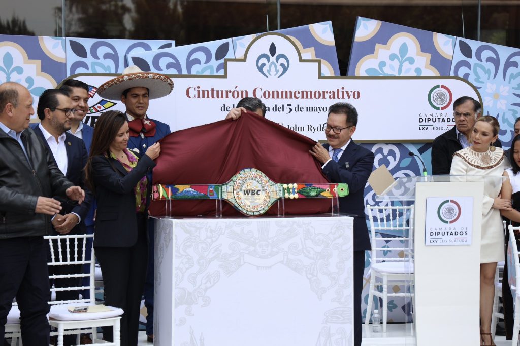 El cinturón que se entregará al ganador de la pelea, en el cual se conmemora la batalla del 5 de Mayo y por parte de Jalisco sus 200 años de soberanía, fue presentado por el diputado federal, Ignacio Mier Velazco.