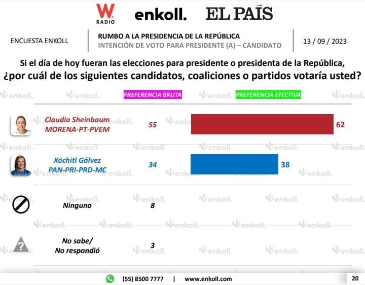 Encuesta realizada por Enkoll para El País da ventaja de 21 puntos a Claudia Sheinbaum sobre Xóchitl Gálvez, rumbo a la elección presidencial.