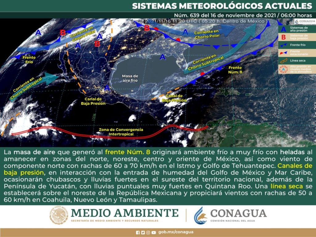 Por otro lado, el organismo perteneciente a la Comisión Nacional del Agua (Conagua), informó sobre la presencia de canales de baja presión en el sureste de México y Península de Yucatán.