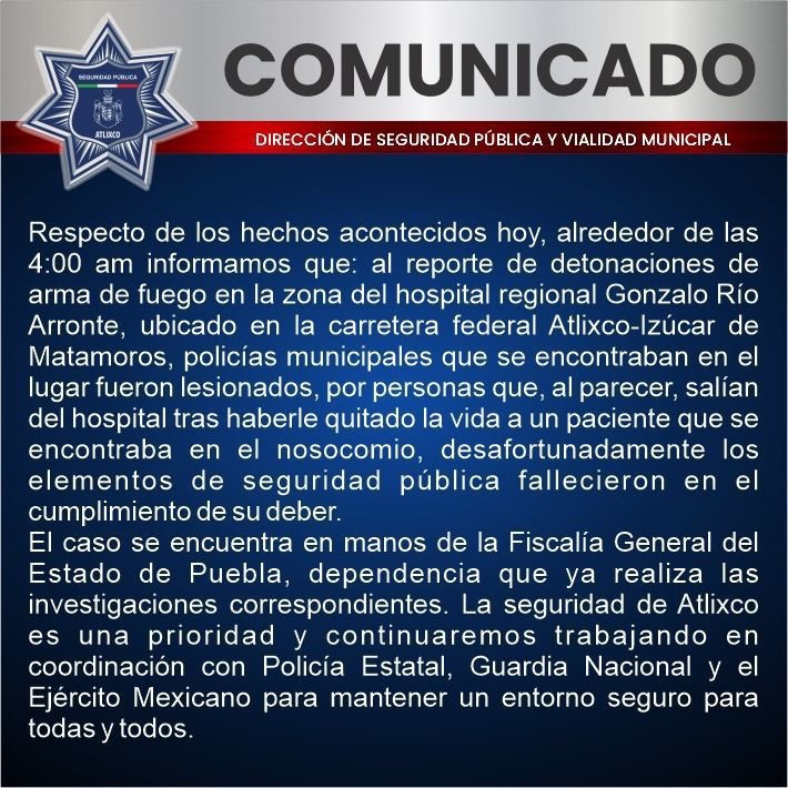 Por estos hechos, el municipio de Atlixcoemitió un comunicado en el que confirmó la muerte de los dos elementos de la policía por personas que salían del hospital regional “Gonzalo Río Arronte”, luego de haber quitado la vida a un paciente.