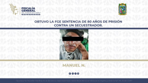 La Fiscalía General del Estado informa que obtuvo una sentencia de 80 años de prisión en contra de un secuestrador quien en 2019, en compañía de otros sujetos, plagió y privó de la vida a la víctima, hechos registrados en el municipio de Tianguismanalco.