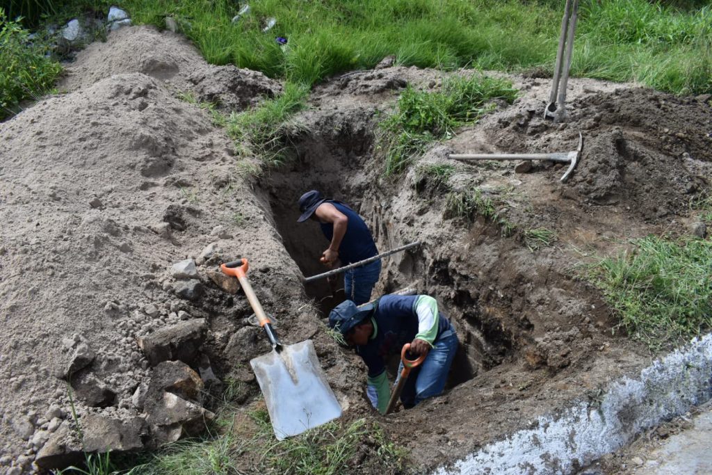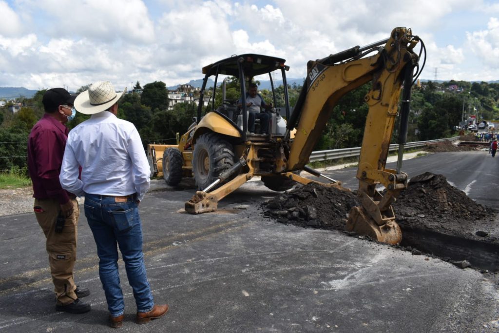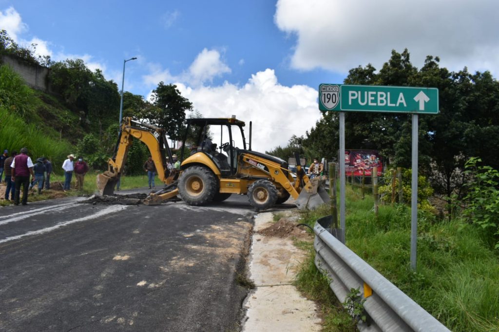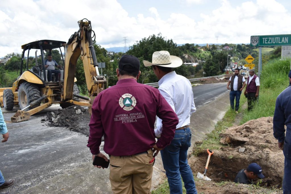 Personal del Ayuntamiento de Tlatlauquitepec y del Sistema Operador de Agua en el municipio, continúan los trabajos para desviar el flujo de agua que provocó el socavón en el kilómetro 130 + 200 de la carretera federal Amozoc – Nautla.