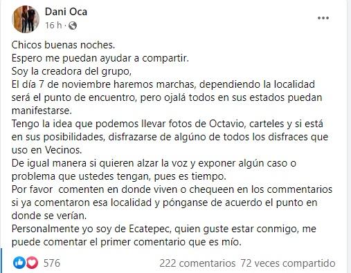 «El día 7 de noviembre haremos marchas, dependiendo la localidad será el punto de encuentro, pero ojalá todos en sus estados puedan manifestarse», escribió la responsable del grupo, Dani Oca.