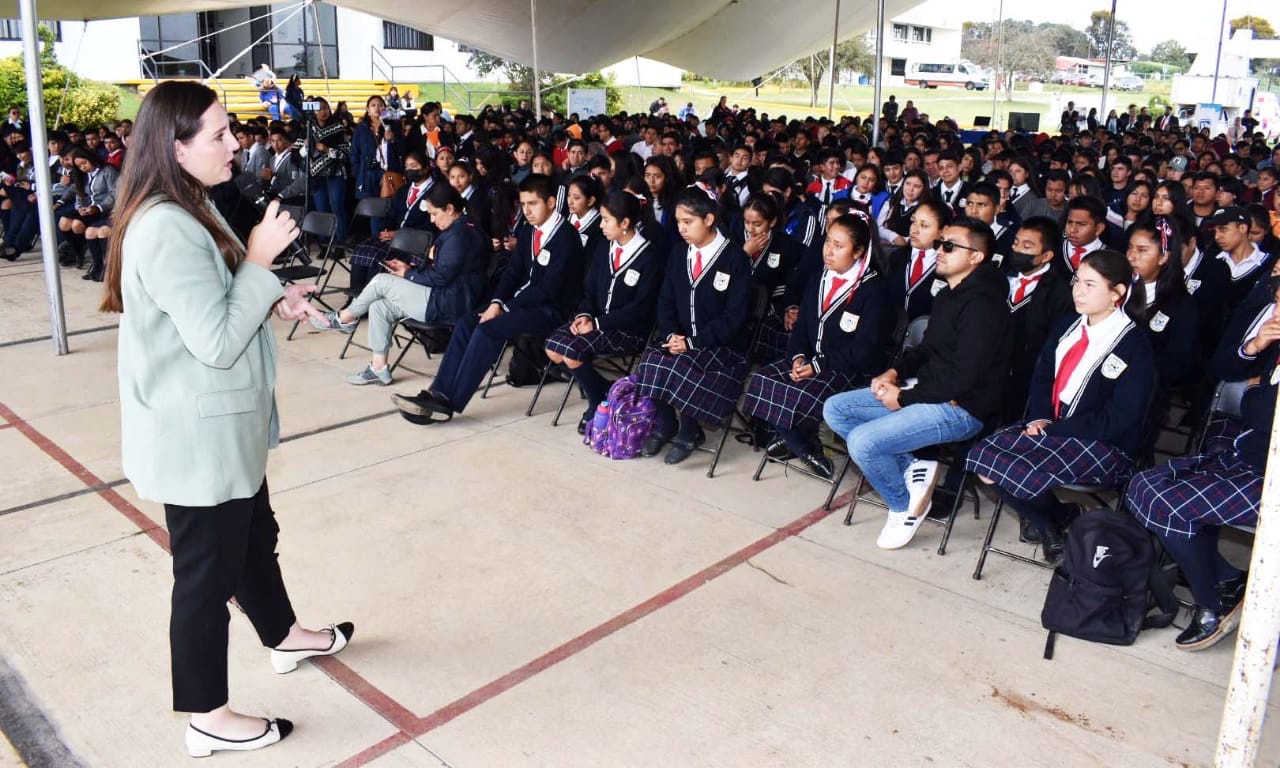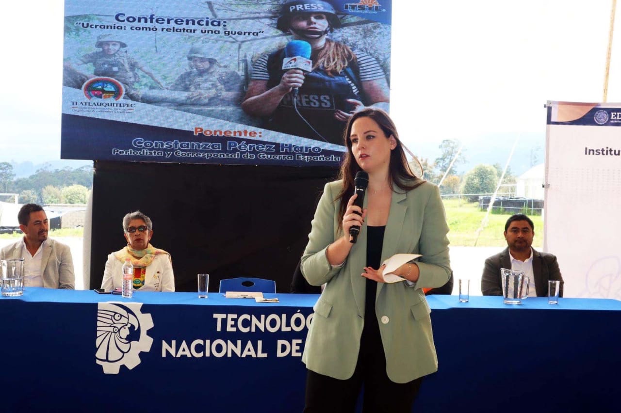 La Periodista y Corresponsal de Guerra Española, Constanza Pérez Haro, quien realizó cobertura de la Guerra entre Ucrania y Rusia, presentó una ponencia ante estudiantes de bachilleratos y de nivel superior del municipio de Tlatlauquitepec.