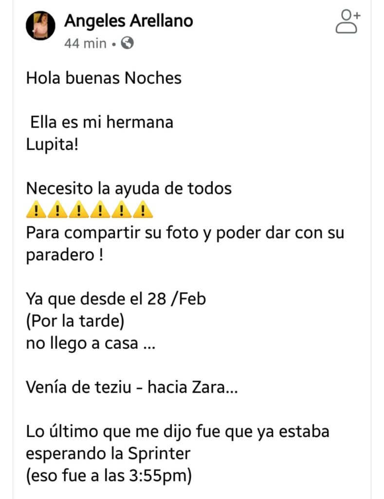La joven de 18 años había ido a visitar a un familiar, pero debido a que tardó demasiado en comunicarse y rebasando el tiempo estimado que le toma en llegar de la ciudad de Teziutlán a Zaragoza, amigos y familiares contactaron medios de la región para difundir la información, en donde se lee «Buenas noches ella es mi hermana Lupita, necesito la ayuda de todos para dar con su paradero» post que fue publicado por la hermana de la joven.