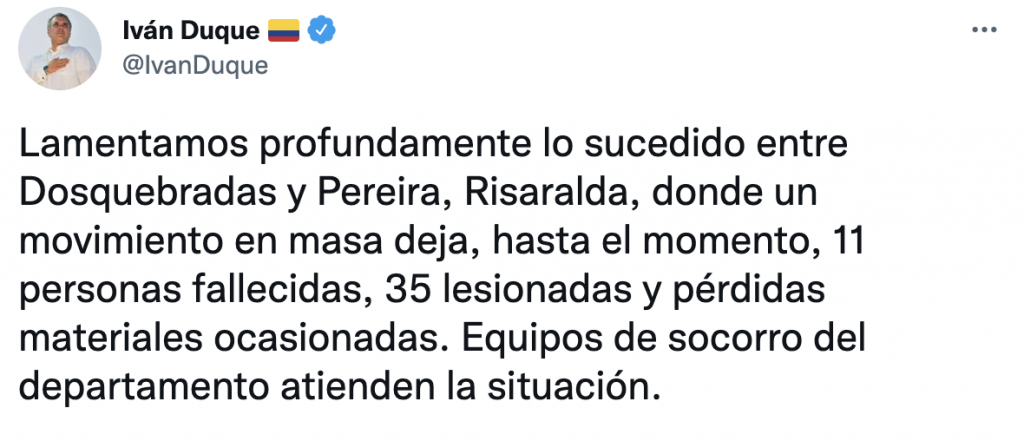En tanto, el presidente colombiano, Iván Duque, expresó su pesar por lo ocurrido y ha cifrado en 35 las personas heridas, a la par que ha lamentado las pérdidas materiales ocasionadas por el desastre, y ha informado de que los servicios de emergencias están preparados para intervenir cuando sea necesario.