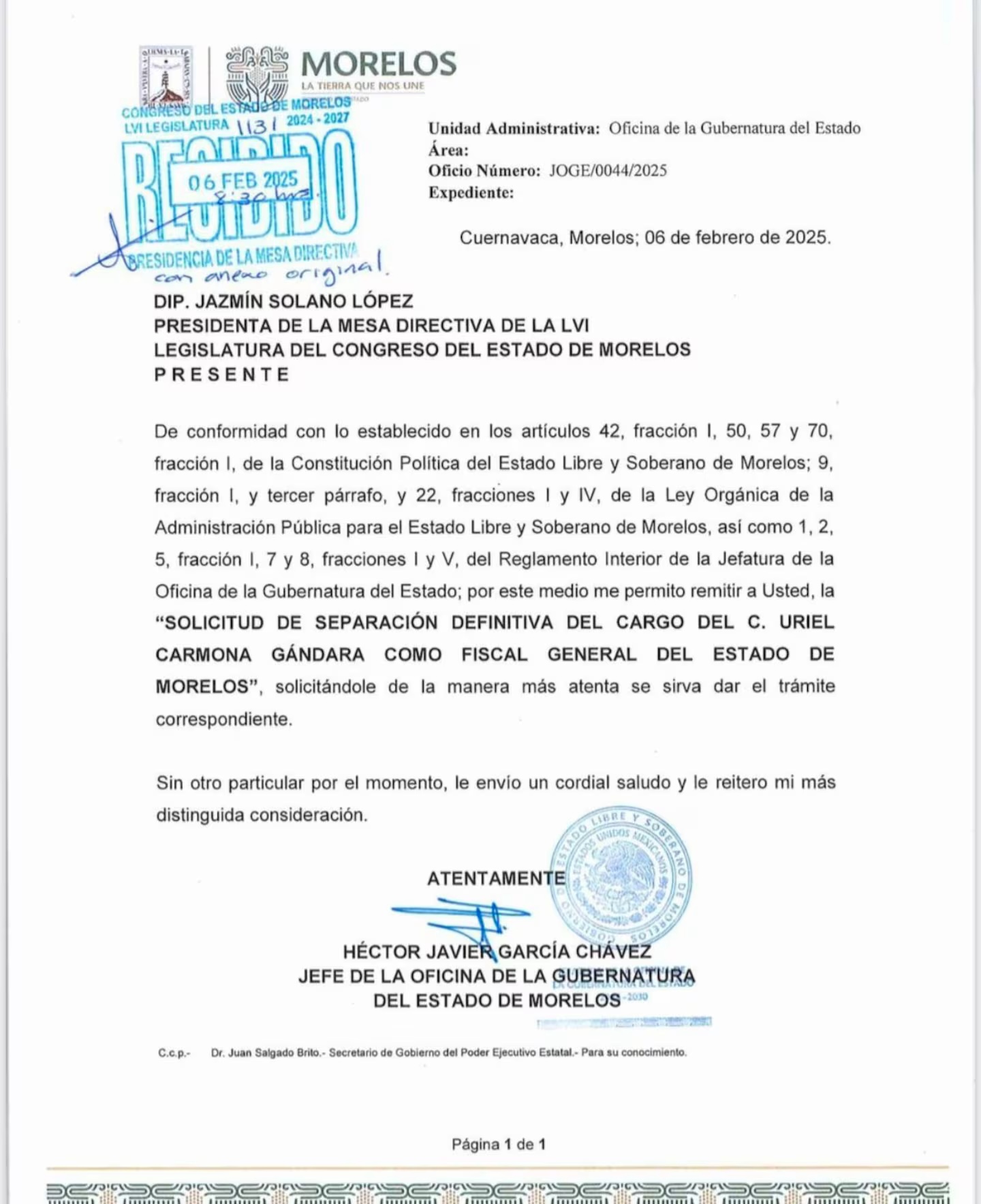 El Gobierno de Morelos pidió al Congreso del estado remover a Uriel Carmona Gándara, esto a unas horas de que el funcionario presentó una solicitud de desafuero en contra de Cuauhtémoc Blanco, diputado federal y exgobernador de la entidad.