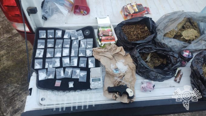 Al hacerle una revisión, los policías estatales encontraron paquetes con hierba seca con características de la marihuana, con un peso de tres kilos, diversas dosis de aparente cristal y un arma de fuego calibre 22, por lo que fue detenida.
