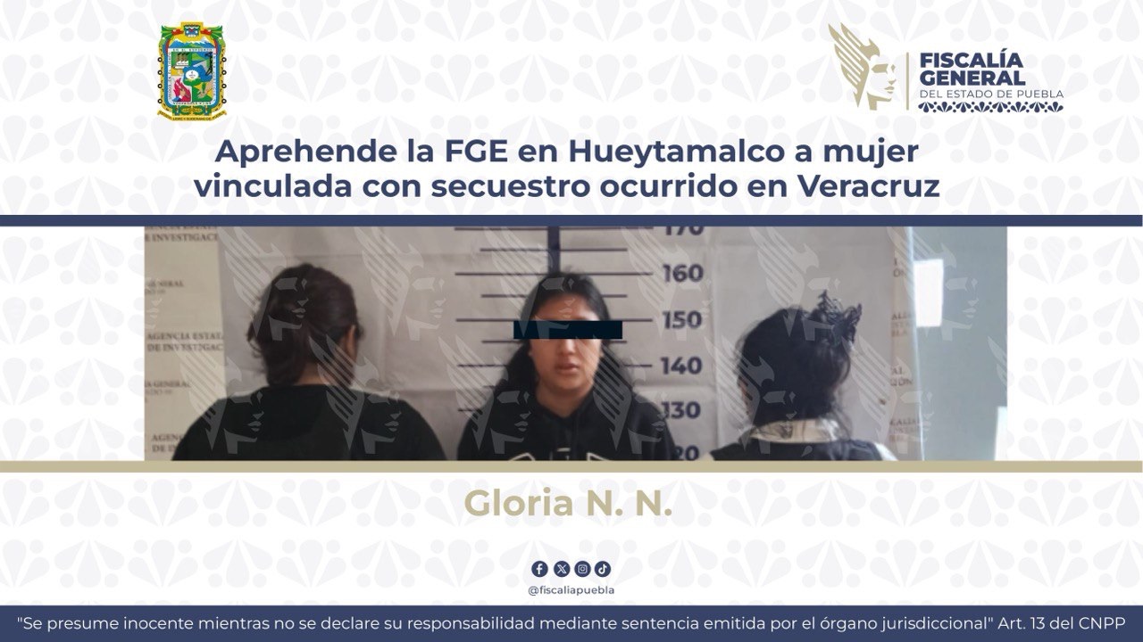 La Fiscalía General del Estado de Puebla aprehendió en el municipio de Hueytamalco a Gloria N. N., de 18 años de edad, quien está vinculada con un caso de secuestro agravado ocurrido en abril de 2024 en el estado de Veracruz.