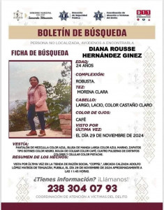 A la mujer de 24 años de edad la reportaron como desaparecida el pasado 29 de noviembre. De acuerdo con el boletín de búsqueda, la vieron por última vez en la tienda Coppel ubicada en la calzada Adolfo López Mateos de dicho municipio.