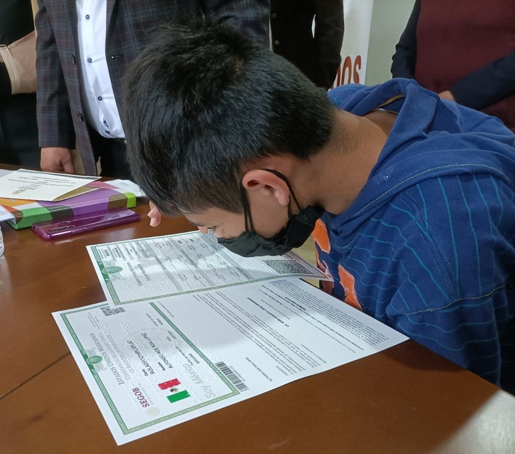Teziutlán, Puebla.- “Gracias a una iniciativa de Rosario Orozco Caballero presidenta del sistema DIF en la entidad poblana, quien es una persona muy humana y sensible a las necesidades de toda nuestra población más vulnerable, es que se creó este programa y podemos entregar el día de hoy un total de 7 actas de nacimiento en sistema Braille; para nosotros como DIF municipal es muy importante poder apoyar a las personas con discapacidad visual, gracias también al respaldo del gobierno de Carlos Peredo Grau, quien siempre ésta al pendiente de que ofrezcamos mejores servicios a toda nuestra gente”.