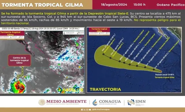 La tarde de este domingo se formó la Tormenta Tropical Gilma a 475 km al sur-suroeste de Isla Socorro, en Colima, y a 945 km al sur-suroeste de Cabo San Lucas, en Baja California Sur, confirmó el Servicio Meteorológico Nacional (SMN), el cual prevé que el jueves se convierta en huracán de categoría 1.