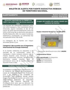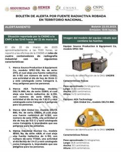 La Comisión Nacional de Seguridad Nuclear y Salvaguardias emitió una alerta de riesgo por radioactividad hacia los estados de Aguascalientes, Guanajuato, Jalisco, Querétaro, Michoacán, San Luis Potosí y Zacatecas, debido al robo de equipo de radiografía industrial en Salamanca, Guanajuato.
