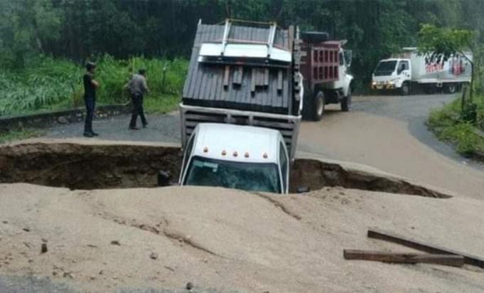 La Coordinación Estatal de Protección Civil de Oaxaca (CEPCO) informó que una camioneta de la Secretaría de Comunicaciones y Transportes (SCT) que se dirigía a supervisar y rehabilitar el camino en esta zona cayó en el socavón.
