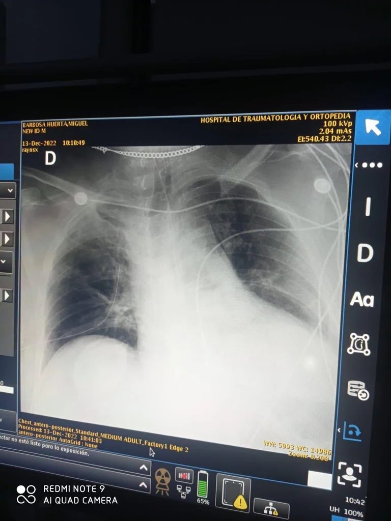 La siguiente presunta negligencia aparentemente ocurrió al revisarlo en el Hospital de Ortopedia, pues le habrían hecho un mal procedimiento que terminó por perforarle el pulmón que aparece del lado izquierdo de la radiografía. Según el periodista se lo “poncharon”.