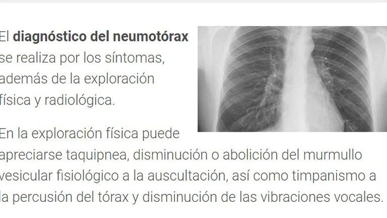 Para ser tratado, los médicos deben confirmar el estado de los pulmones con una radiografía y aplicar alguna de las técnicas médicas disponibles, entre las que se encuentran la introducción de talco o tetraciclinas para producir adherencias, la cirugía, así como la inserción de una sonda torácica, la cual puede ser muy riesgosa.