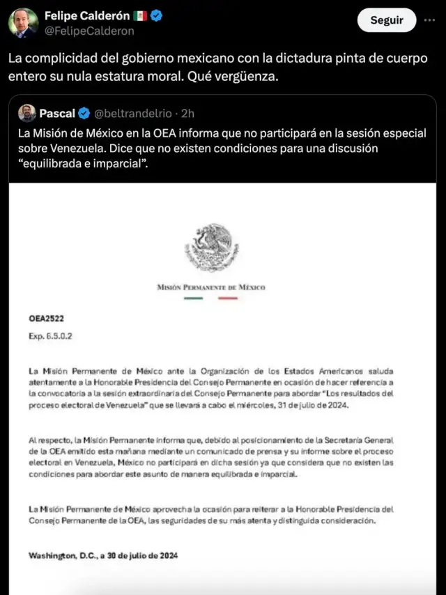 En una publicación realizada en su cuenta oficial de X, antes conocida como Twitter, Calderón expresó su descontento por la decisión de la delegación mexicana de ausentarse de dicha sesión. La sesión del Consejo Permanente de la OEA estaba programada para el miércoles 31 de julio y su propósito fue abordar los resultados del proceso electoral en Venezuela, un país que ha estado sumido en una profunda crisis política y social.
