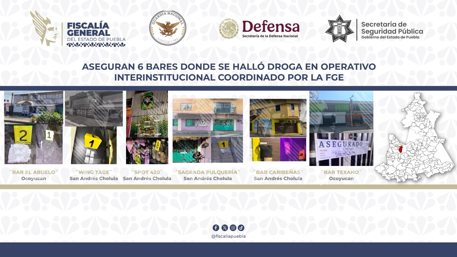 La Fiscalía General del Estado de Puebla coordinó un operativo interinstitucional de seguridad en diferentes bares y chelerías de los municipios de San Andrés Cholula y Santa Clara Ocoyucan que dio como resultado el aseguramiento de seis lugares dedicados a este giro donde fue hallada droga.