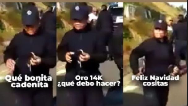 En la primera imagen se ve a la policía caminar mientras mira la cadena con el mensaje: “Qué bonita cadenita”.