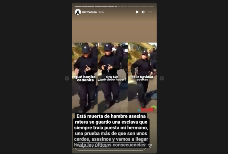 “¡No les bastó matarlo puercos! Le robaron todo lo que pudieron. ¡Esa cadena era nuestra! ¡Ojalá se pudran en la cárcel!”, señaló, como pie de foto de secuencia de tres imágenes de la mujer policía, cuando se guarda la esclava en el bolsillo trasero de su uniforme azul.