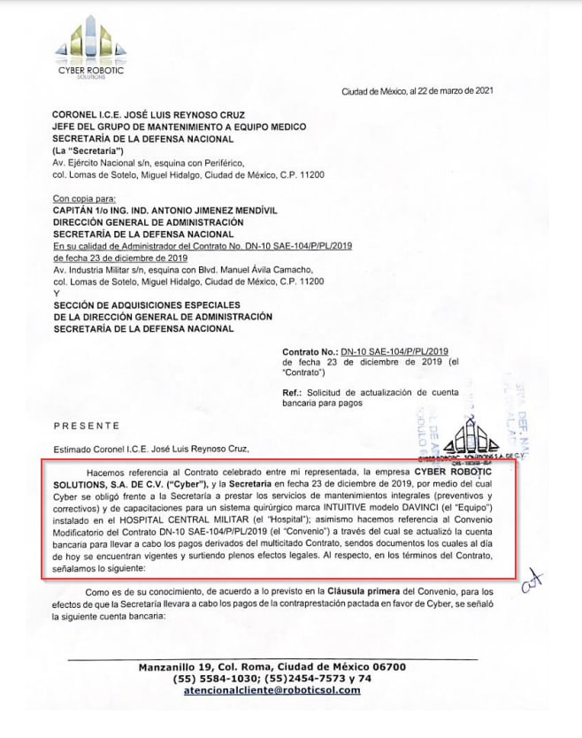 Dicho contrato no está disponible en la Plataforma Nacional de Transparencia ni en el portal COMPRANET, pero en los correos filtrados en #GuacamayaLeaks se pueden observar oficios donde la empresa Cyber Robotics Solutions es requerida por la Sedena para que brinde capacitación a médicos que reciben dicho contrato.