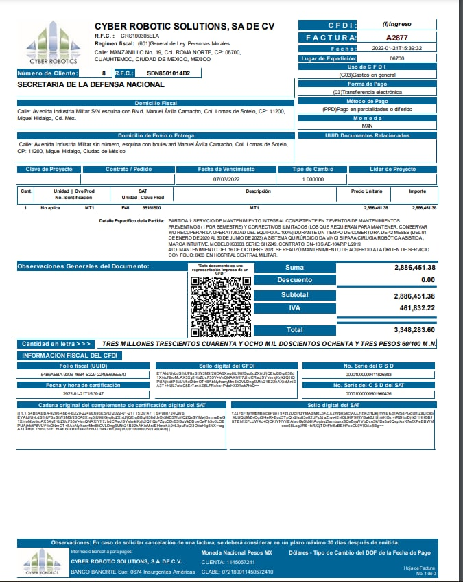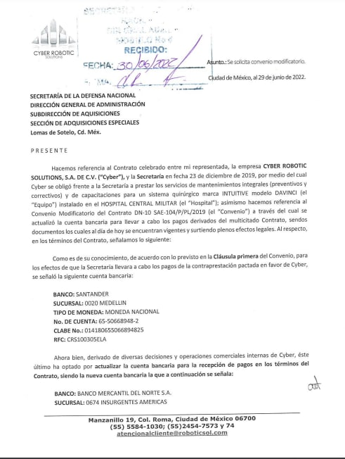 Según los documentos filtrados, el contrato se firmó el 23 de diciembre de 2019 y, desde entonces, fue ocultado en las plataformas de transparencia. Esto, a pesar de que hasta el momento la Sedena pagó cinco facturas que ascienden a los 16 millones 921 mil 415 pesos. Cada factura viene por el servicio de: “Partida 1: servicio de mantenimiento integral consistente en 7 eventos de mantenimientos programados (1 por semestre), durante 42 meses. para el mantenimiento del sistema quirúrgico Da Vinci”.