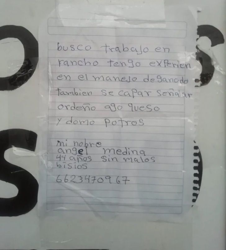 “Busco trabajo en rancho, tengo experiencia en el manejo de ganado, también sé capar, ordeñar, hago queso y domo potros. Mi nombre es Ángel Medina, de 44 años, sin malos vicios” escribió.