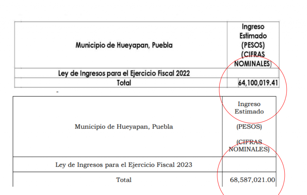 Del ejercicio 2022 según la Ley de Ingresos para ese año, Hueyapan recibió poco más 64 millones, y para este año tiene proyectado recibir más de 68.