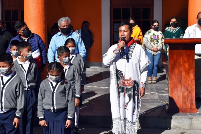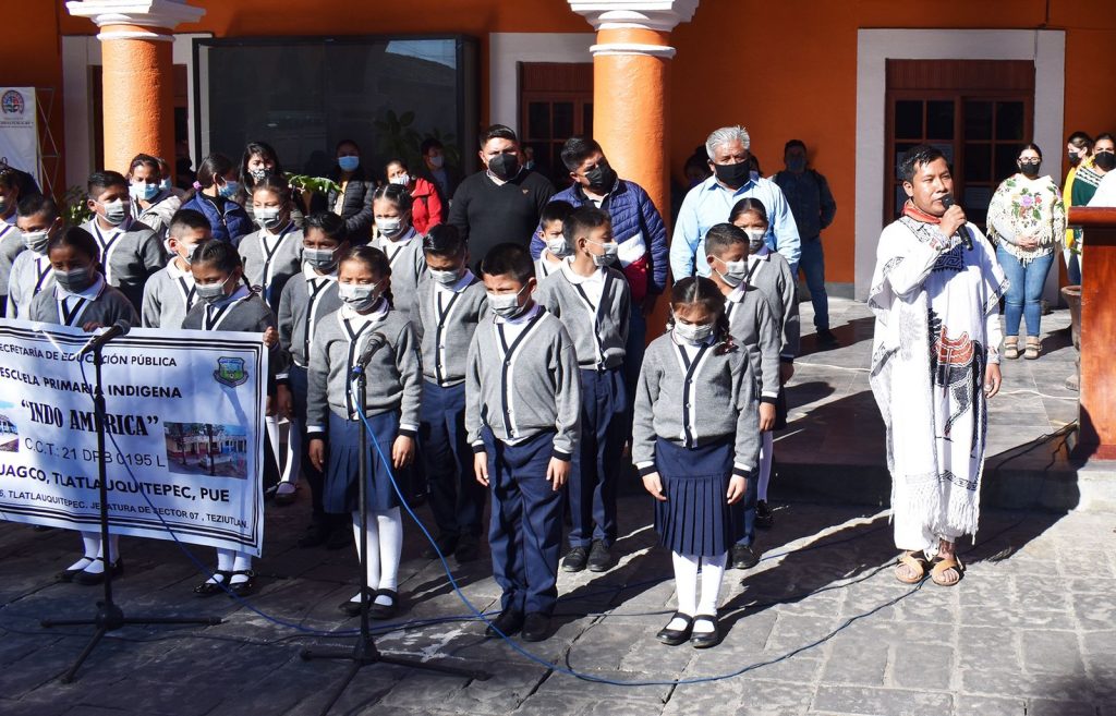 En el Día Internacional de la Lengua Materna que se celebró este 21 de febrero, alumnos de la Escuela Primaria “Indo América” de la comunidad de Tehuagco, interpretaron el Himno Nacional en náhuatl y en español, como muestra de la conservación del idioma que heredaron los pueblos indígenas.