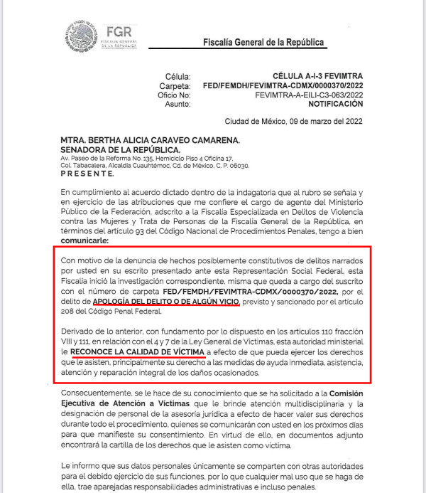 En escrito oficial se informa que la FGR reconoce a la legisladora como víctima y reporta que ahora se abocará a reunir información sobre el tema, encuadrado como un delito en el Código Penal Federal.