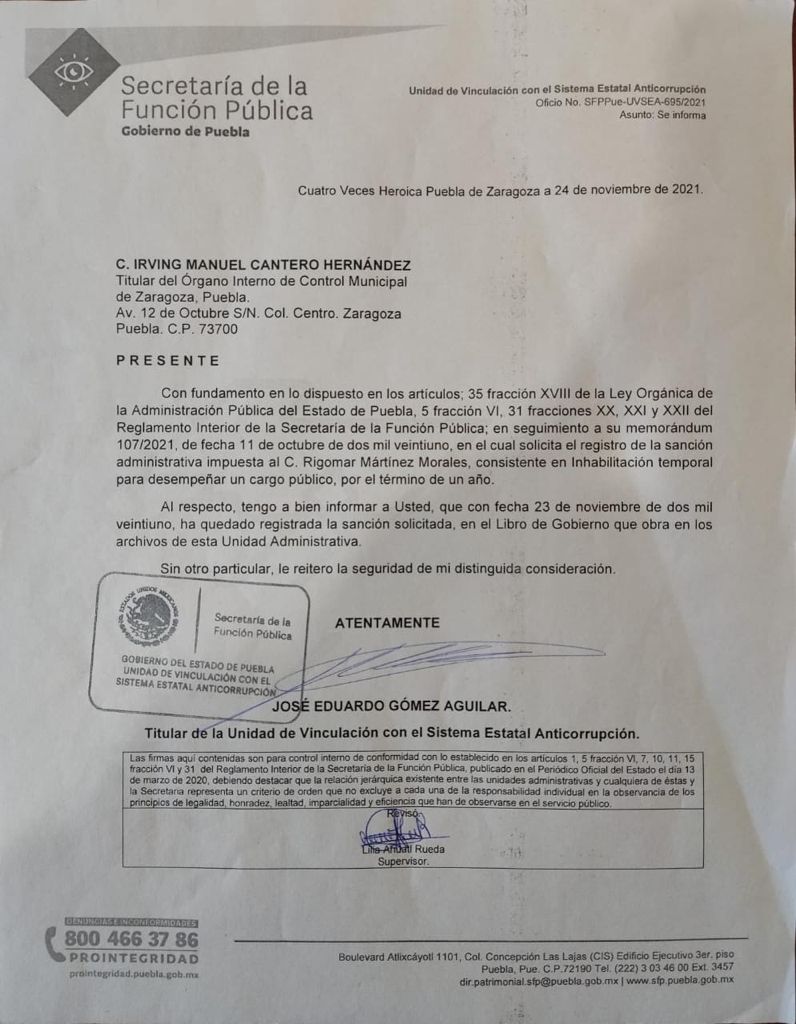 La unidad administrativa de la Secretaría de la Función Pública mediante el documento, notificó al titular del órgano interno de control municipal que Martínez Morales no podrá desempeñar un cargo público durante un período de un año.