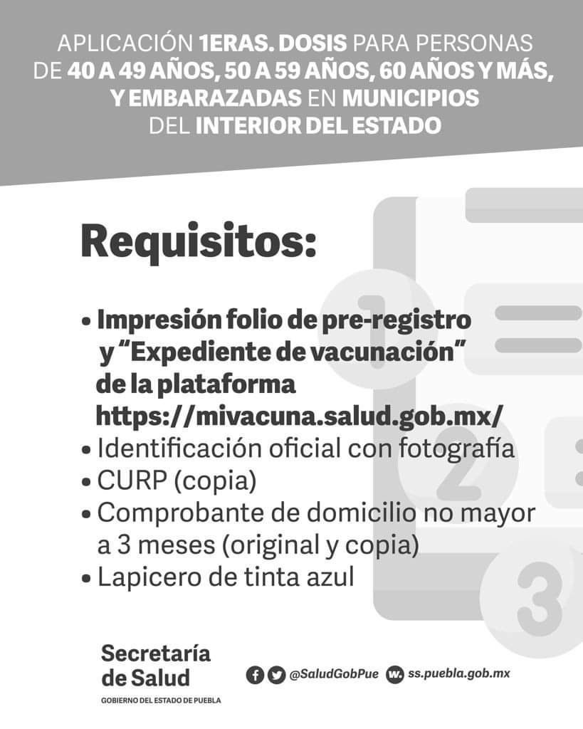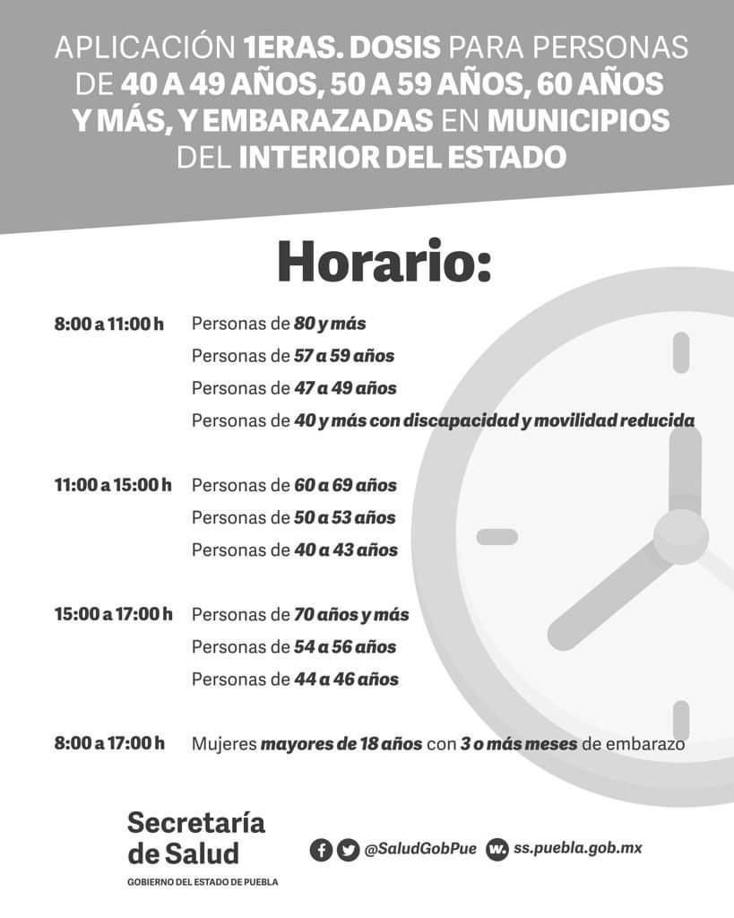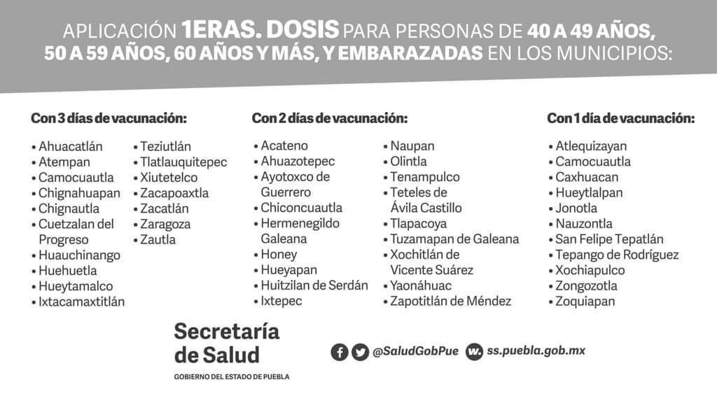De acuerdo a la Secretaría de Salud (SSA) del Estado de Puebla, se llevará a cabo la jornada de vacunación para aplicar la primera dosis a la población de 40 a 49 años, de 50 a 59 años, adultos mayores de 60 años y más que faltaron, así como embarazadas mayores de 18 años con más de tres meses de gestación.