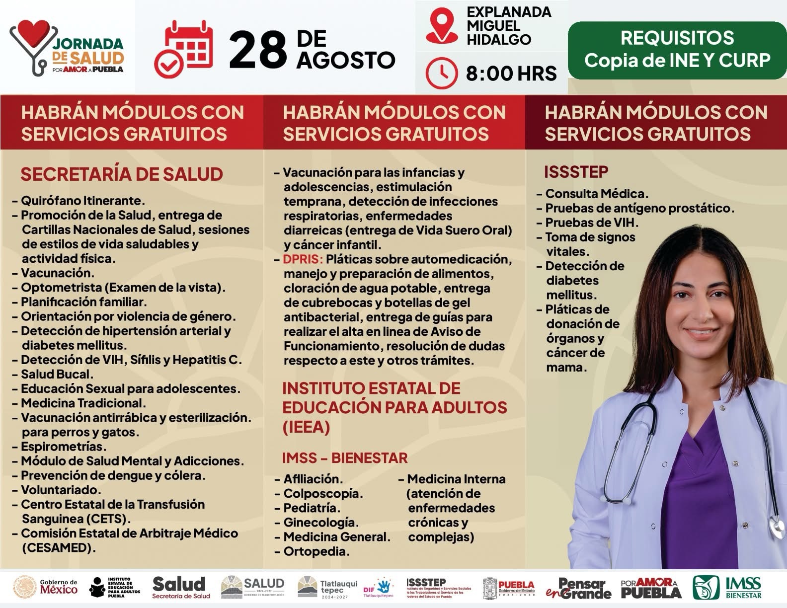 Tlatlauquitepec, Pue.- Este jueves 28 de agosto, el zócalo del municipio será sede de la jornada de salud integral “Por Amor a Puebla”, que ofrecerá 33 servicios médicos completamente gratuitos, desde consultas hasta cirugías de mínima complejidad y vacunación para todas las edades. Las autoridades invitan a toda la población a aprovechar esta iniciativa estatal y federal.