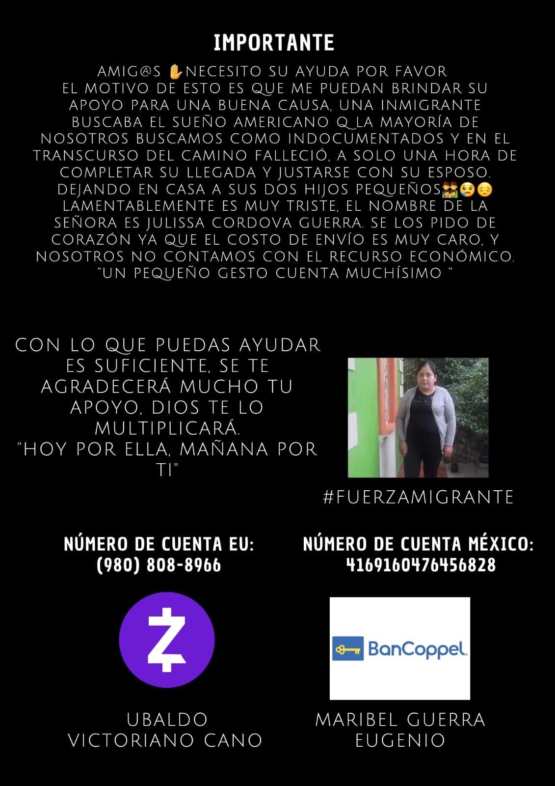 A través de este medio de comunicación, familiares piden el apoyo, a toda aquella persona que quiera sumarse, para reunir el dinero suficiente, y de esta manera, lograr repatriar el cuerpo de la joven a su tierra natal, donde la esperan sus dos hijos, a los cuales encargó, con la esperanza de tener una vida mejor y vivir el ‘Sueño Americano’.