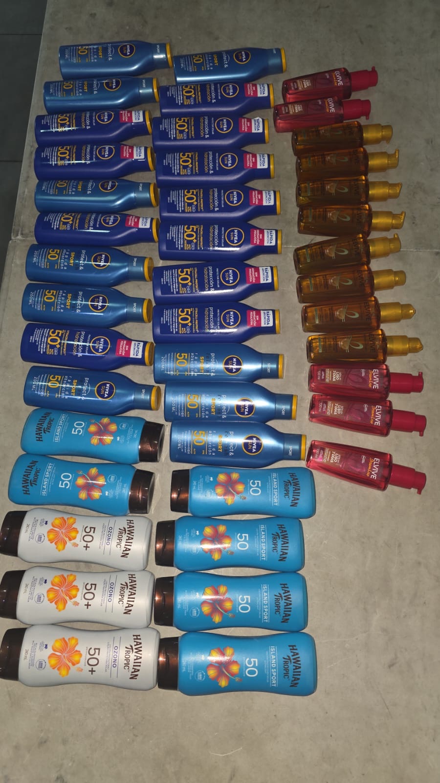Entre la mercancía asegurada se encontraban tratamientos capilares, sueros y múltiples piezas de bloqueadores solares de distintas marcas, lo que derivó en la decisión de la parte afectada de proceder legalmente.