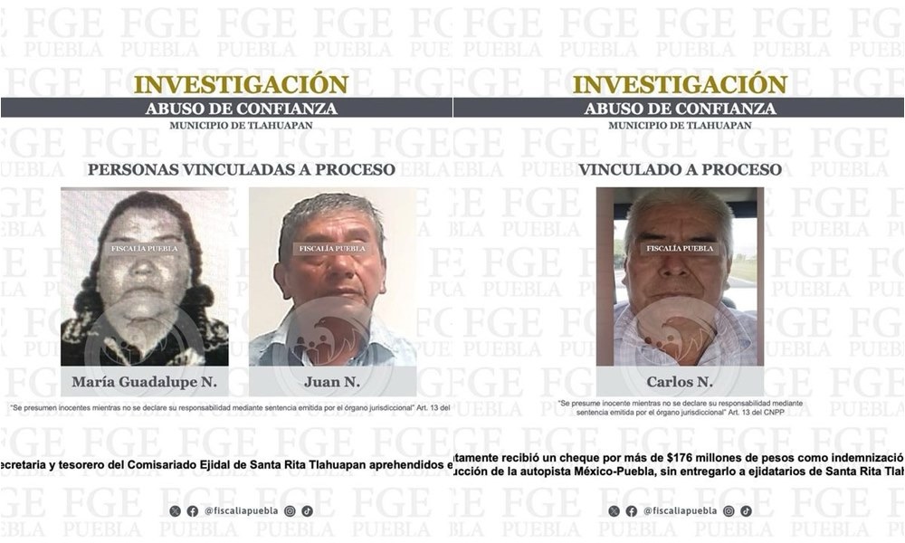 Mediante un comunicado emitido por la fiscalía general del Estado de Puebla el jueves 22 de agosto, se informó que por abuso de confianza fue aprehendido en Querétaro, Carlos N, excomisariado ejidal 2018, ya que, en 2018 en complicidad con el Tesorero Juan N, y su secretaria, utilizaron para sí, más de $176 millones de pesos como indemnización por la construcción de la autopista México-Puebla, sin entregarla a ejidatarios de Tlahuapan.